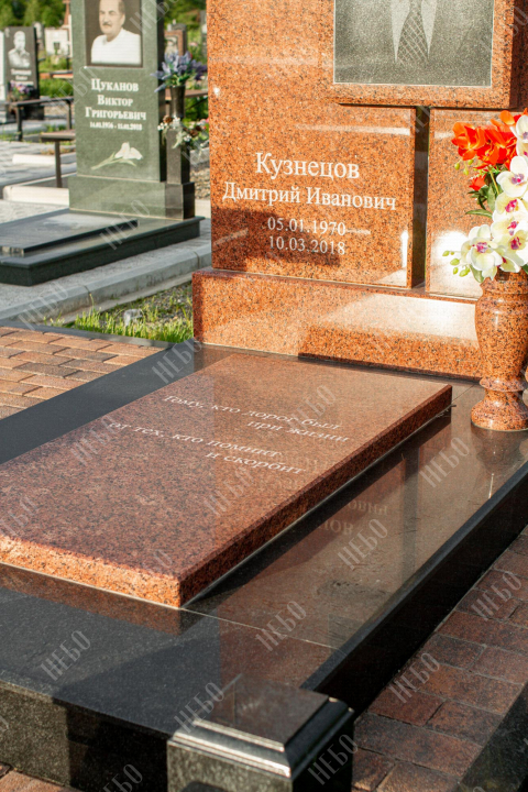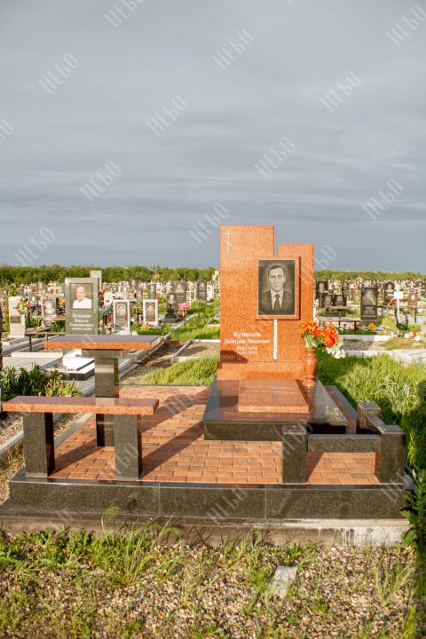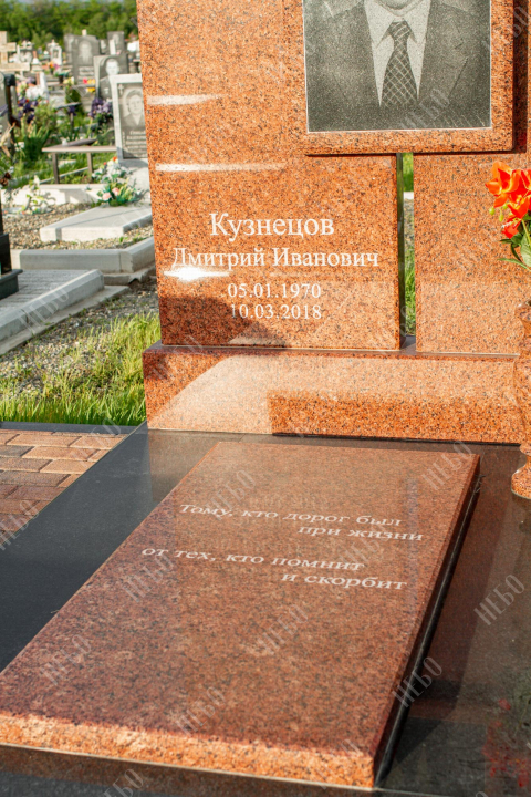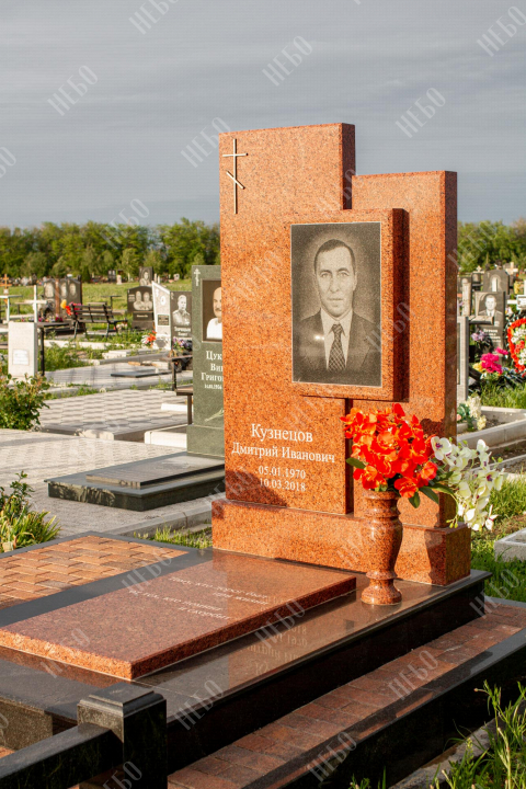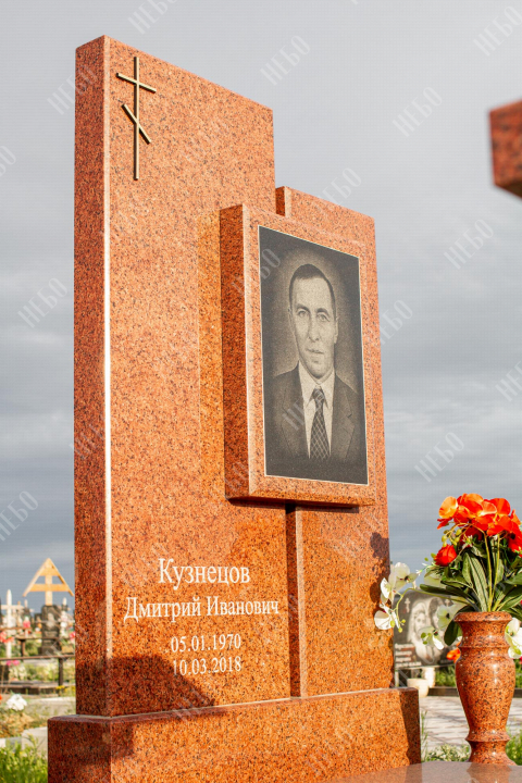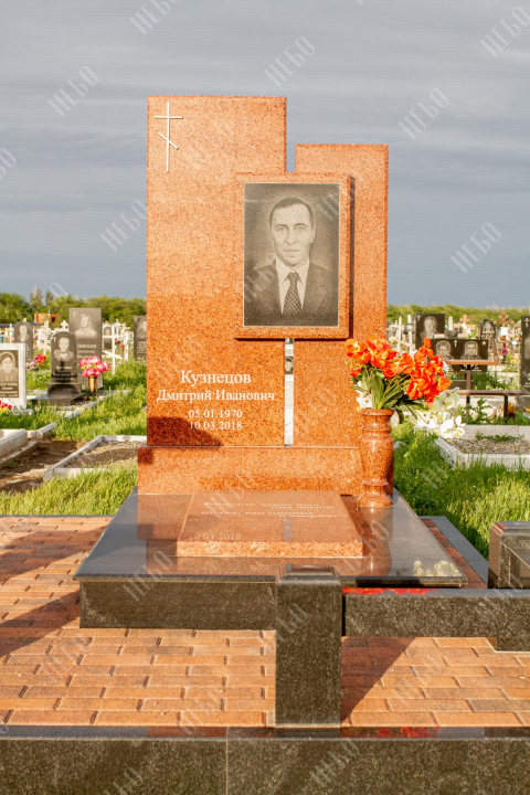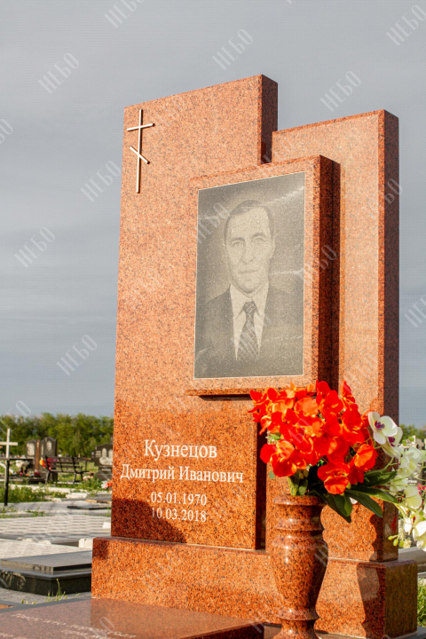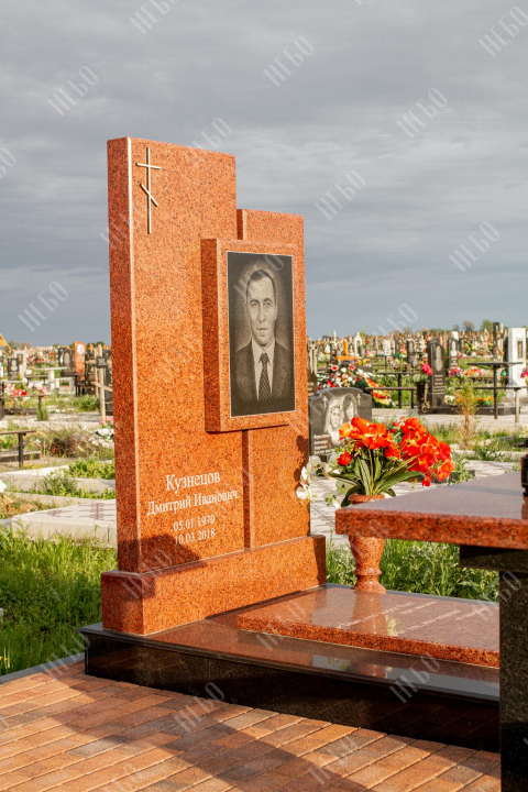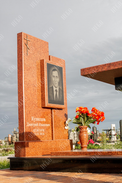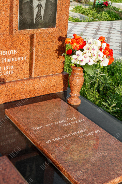 Памятник для православного человека с двухуровневой стелой, вазой и закрытым надгробием. Ритуальное изделие имеет широкую ассиметричную стелу, состоящую из двух частей. По центру памятника располагается фото усопшего, а на закрытой надгробной плите - эпитафия. На территории площадки захоронения размещен гранитный стол и скамья, которые служат не только предметом практичности, но и дополнительным декоративным элементом. Вся ритуальная композиция смотрится дорого и приковывает взгляды. Размеры стелы и надгробия соответствуют заданным нормам при имеющейся нагрузке и исключают деформации со временем.
