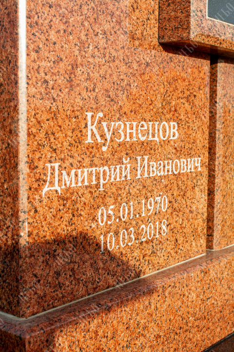 Фото на ритуальном изделии изготовлено методом гравировки алмазными иглами на черном граните. Далее фотография вставлена в памятник из выбранного материала, создавая эффект контрастности. Такой способ вставки изображения применяется в случае изготовления памятника из материалов светлых, серых, коричневых и других оттенков, гарантируя фотографии четкость и наилучшее качество, а готовому изделию долговечность. Благодаря использованию технологии гравировки на граните, фото не потускнеет со временем, не исказится и сохранит первозданный вид десятки лет.