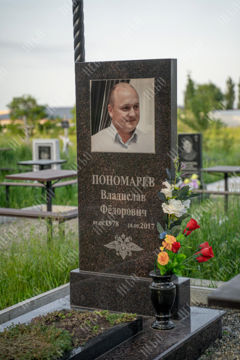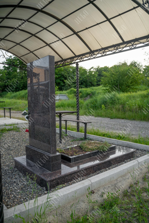 Прямой памятник с гранитной вазой и открытым надгробием выполнен в строгом лаконичном стиле с использованием четких геометрических линий. Темные оттенки и прямоугольные формы стелы и надгробия являются классической комбинацией, которая часто используется при изготовлении памятников. Открытое гранитное надгробие позволяет высадить на поверхности цветы и другие растения. При изготовлении памятника специалисты тщательно прорабатывают соотношение форм, размеров и нагрузку, чтобы исключить деформации и искажения изделия со временем.
